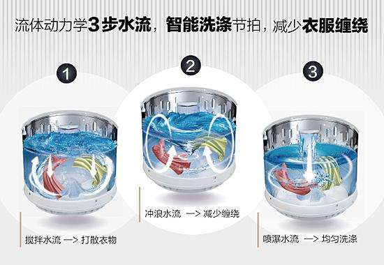 洗滌時(shí)首先通過攪拌水流打散衣物,就像手洗一般揉搓呵護(hù)洗滌;再利用沖浪水流拍打衣物,深層潔凈去污;最后利用噴瀑水流強(qiáng)力沖刷,祛除殘留洗滌劑和污水,讓衣物徹底潔凈。