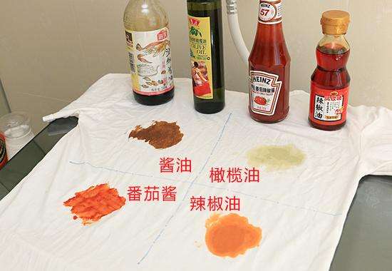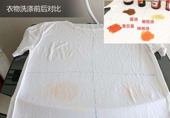 將純白色文化衫用“醬油、橄欖油、番茄醬和辣椒油”四種生活常見污漬涂抹,模擬家庭常規(guī)洗滌過程,選擇洗衣機(jī)“標(biāo)準(zhǔn)洗”程序,對(duì)衣物進(jìn)行洗滌測(cè)試。