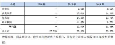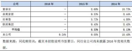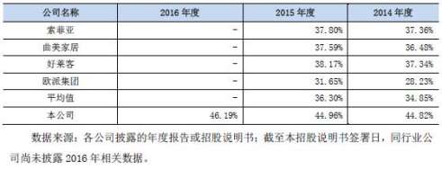 2013年至2016年,尚品宅配綜合毛利率分別為47.01%、44.82%、44.96%和\u00A046.19%,高于同行業(yè)公司的平均水平,2014至2016年,同行業(yè)公司綜合業(yè)務(wù)毛利率平均值為34.85%和36.30%。\u00A0