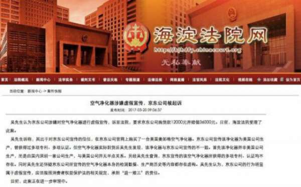 據(jù)海淀法院官網(wǎng)3月20日消息,空氣凈化器涉嫌虛假宣傳,京東公司被起訴。這位吳姓消費(fèi)者要求京東公司購貨款12000元并賠償36000元。日前,海淀法院受理了此案。
