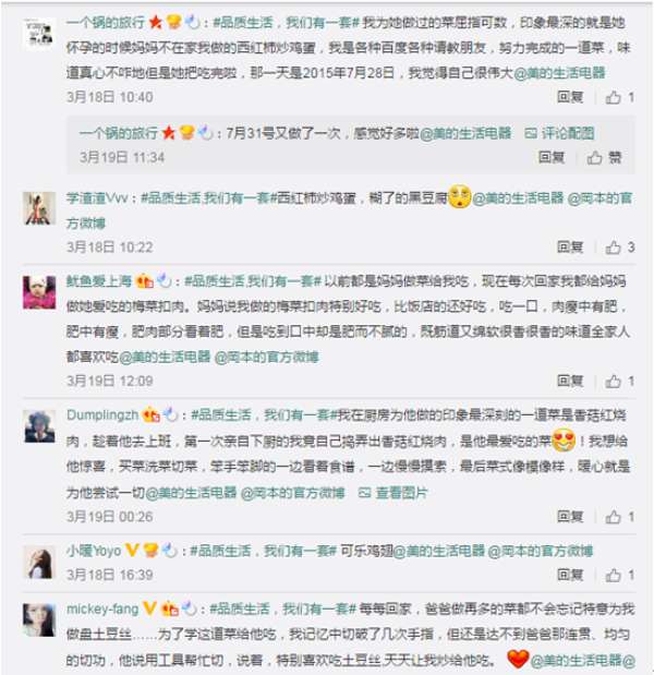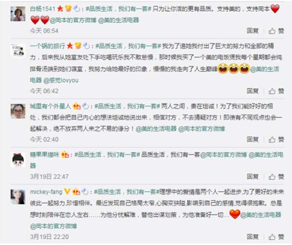 美的生活電器和岡本甚至化身恩愛小冤家,在“廚房里為TA做過印象最深刻的一道菜是什么?”等微博熱門話題的爭論中互不相讓,配合美的小家電和岡本冰感透薄產(chǎn)品組合成一套禮包作為粉絲,官博底下眾多品牌紛紛回應(yīng),KOL強勢發(fā)聲,熱情粉絲參與互動分享,回復(fù)內(nèi)容千奇百怪,反應(yīng)熱烈,微博總互動量突破3000。