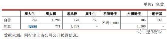 截至2016 年6月30日,周大生擁有自營店294家,加盟店1994家,相比其他兩家周姓珠寶店,加盟店占主流。對比如下: