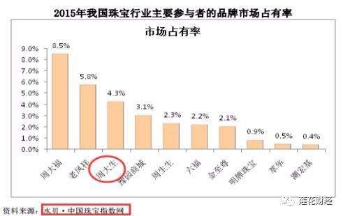 具體來看,中國珠寶行業(yè)老大是周大福,老鳳祥第二,自己是老三,周生生第四。境內(nèi)珠寶首飾市場品牌占有率前三名市場份額為18.60%。
