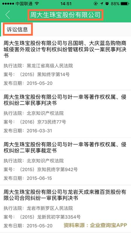 此外,周大生在招股書的風險提示中指出,公司面臨著被同行業其他珠寶商抄襲款式和仿冒的風險。據企業查詢寶APP的資料顯示,周大生在注冊商標權、專利權和著作權方面尚有多起未完結案件。