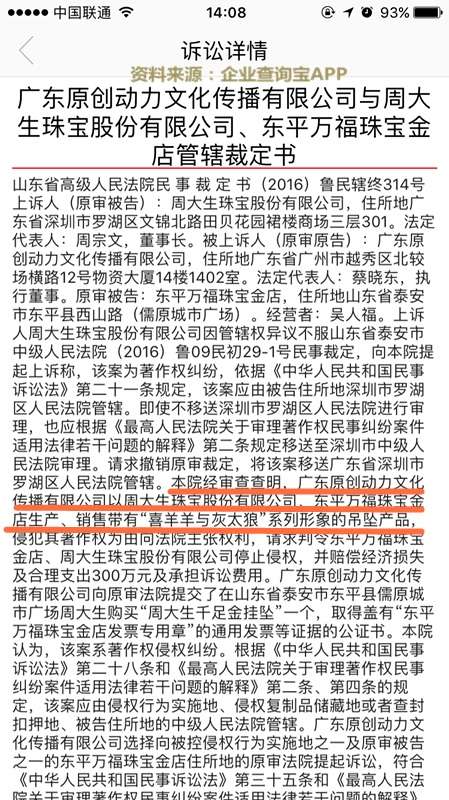 如廣東原創動力文化傳播有限公司起訴周大生和東平萬福珠寶金店(作為共同被告),請求判令被告立即停止侵犯原告享有《喜羊羊與灰太狼》系列作品的著作權,并賠償原告經濟損失及制止侵權行為所支付的合理開支共計300萬元。此案件亦尚未開庭審理。