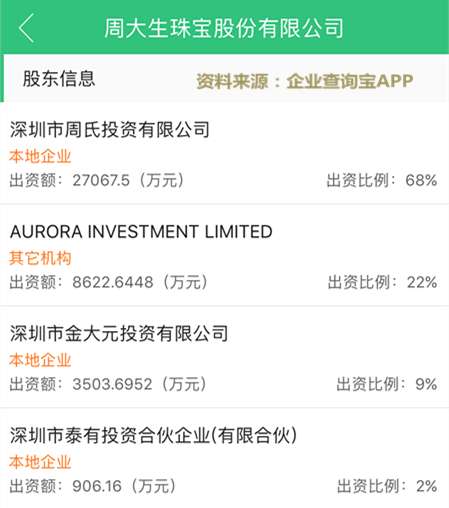 另外,在業界看來,股權高度集中是周大生闖關IPO面臨的又一風險。據招股書,在本次發行前,周大生4名股東分別為:深圳市周氏投資有限公司(以下簡稱“周氏投資”)、深圳市金大元投資有限公司(以下簡稱“金大元”)、深圳市泰有投資合伙企業(有限合伙)(以下簡稱“泰有投資”)和Aurora Investment Limited。其中,周氏投資的法人代表是周宗文,持有90%的股份,余下10%的股份為其妻子周華珍所持有。金大元的法人代表是周飛鳴,周飛鳴是周宗文和周華珍的兒子。周飛鳴在金大元中持股20%,周宗文持股80%。而泰有投資的執行事務合伙人是周華珍,并持股31.86%。