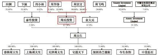也就是說,周宗文和周華珍夫婦則通過周氏投資、金大元、泰有投資間接控制該公司78.50%的股份,處絕對控股地位。如果加上其兒子周飛鳴的股份,周氏一家三口間接持有周大生76.96%的股份。