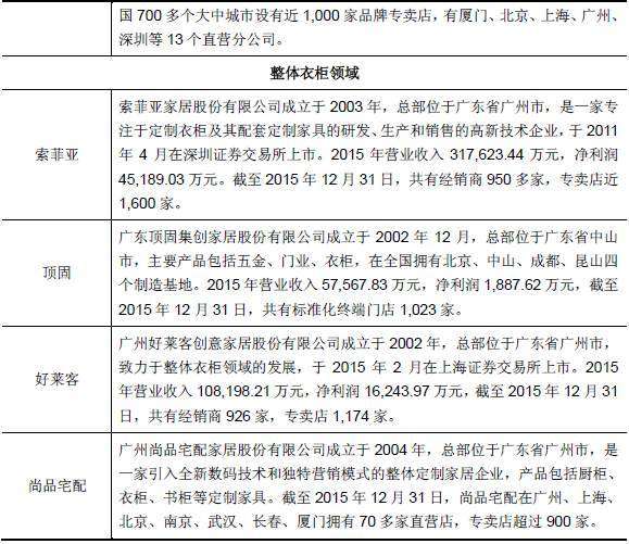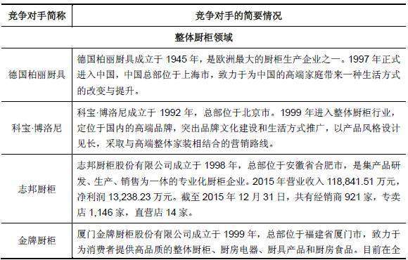 公司在整體廚柜領(lǐng)域和整體衣柜領(lǐng)域的主要競爭對(duì)手如下表所示: