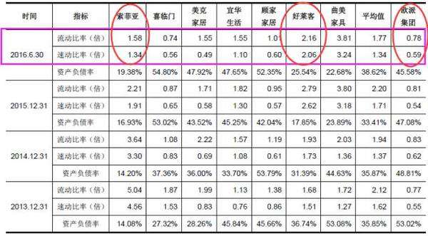 索菲亞、好萊客的流動(dòng)比率分別為1.58倍、2.16倍,速動(dòng)比率分別為1.34倍、2.06倍。