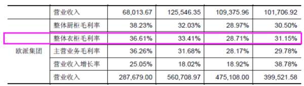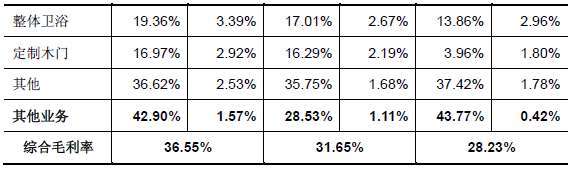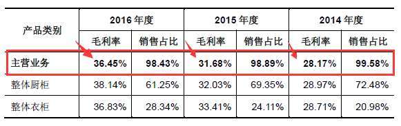 2014年度、2015年度和2016年度,公司銷售的綜合毛利率分別為28.23%、31.65%和36.55%,其中整體廚柜的毛利率最高。