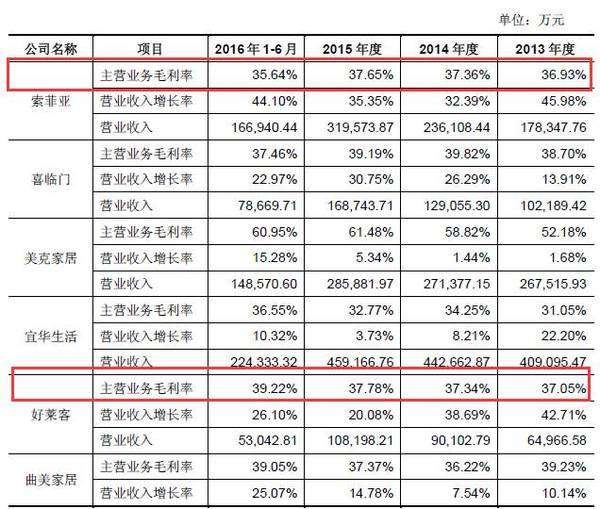 由于在同行業(yè)上市公司中,沒有主要經(jīng)營整體廚柜的企業(yè)。那么,以整體衣柜為主營產(chǎn)品的索菲亞和好萊客作為參考對(duì)象,公司整體衣柜的毛利率和索菲亞和好萊客對(duì)比,也略微遜色。
