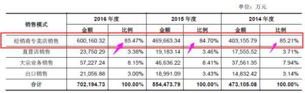 綜上所述,在上述四種銷售模式中,經(jīng)銷商專賣店模式為公司主營業(yè)務(wù)模式,占比在85%以上。