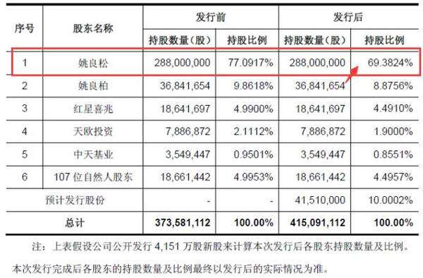 公司擬此次發(fā)行4151萬股,占發(fā)行后總股本的比例為10%。發(fā)行后,實(shí)控人姚良松的持股比例將下降至69.3824%。