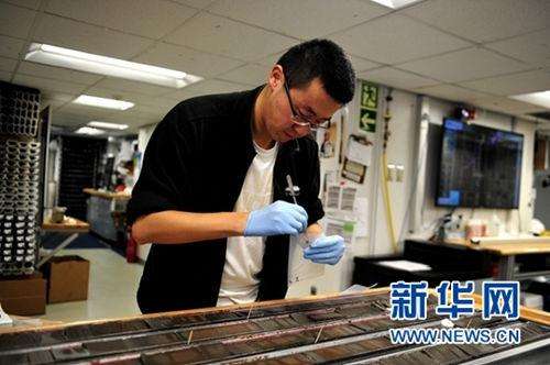中國(guó)科學(xué)院南海海洋研究所蘇翔在“決心”號(hào)上進(jìn)行“超微化石”取樣(3月21日攝)。新華社記者 張建松 攝
