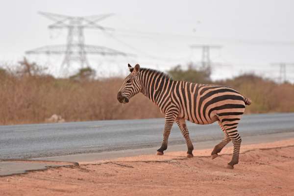 ; ; ; ;在肯尼亞察沃國家公園附近,一匹斑馬穿過蒙內(nèi)鐵路動(dòng)物通道后試圖穿越公路。(新華社記者孫瑞博攝)