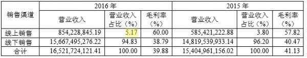 但2016年財報顯示,海瀾之家的銷售渠道分為線上銷售與線下銷售,其中線上銷售的營業(yè)收入為8.54億元,占比為5.17%,線下收入的占比為94.83%。