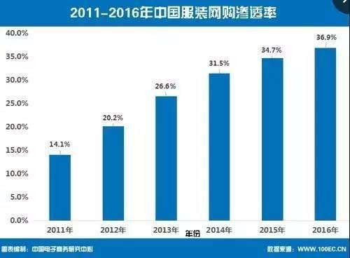 當前,很多服裝品牌都開始利用互聯(lián)網(wǎng)的平臺。借助網(wǎng)紅經(jīng)濟年,我國服裝網(wǎng)購滲透率進一步擴大,2016年服裝網(wǎng)購滲透率將達36.9%,同比增長10%。