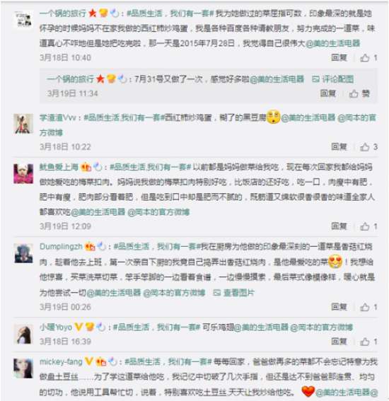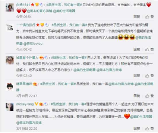 美的生活電器和岡本甚至化身恩愛小冤家,在“廚房里為TA做過印象最深刻的一道菜是什么?”等微博熱門話題的爭論中互不相讓,配合美的小家電和岡本冰感透薄產品組合成一套禮包作為粉絲,官博底下眾多品牌紛紛回應,KOL強勢發聲,熱情粉絲參與互動分享,回復內容千奇百怪,反應熱烈,微博總互動量突破3000。