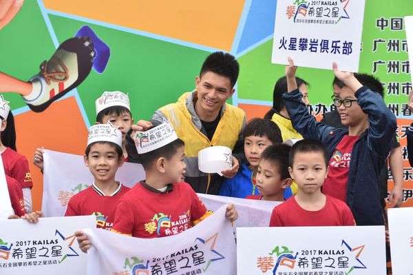 (李致新為鐘齊鑫頒發(fā)證書)9點50分,中國登山協(xié)會主席李致新宣布2017年凱樂石全國攀巖希望之星活動啟動,標(biāo)志著全國攀巖希望之星活動正式拉開帷幕。隨后,中登協(xié)領(lǐng)導(dǎo)與鐘齊鑫和參加活動的小選手們留影拍照,鐘齊鑫還與攀巖小選手們互動,小選手們見到心目中的攀巖巨星抑制不住心中的激動與仰慕,紛紛向鐘齊鑫索要簽名。