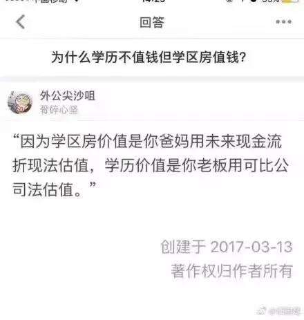 @向小田:為什么學(xué)歷不值錢(qián)而學(xué)區(qū)房值錢(qián)?今天有人問(wèn)這個(gè)問(wèn)題。如果學(xué)歷不值錢(qián)那么學(xué)區(qū)房應(yīng)該也沒(méi)啥用才對(duì),表面上這么想是可以的。但是深層次一想,學(xué)歷從來(lái)都是值錢(qián)的,說(shuō)學(xué)歷不值錢(qián)的,是沒(méi)有用好學(xué)歷。但是如果你讓一個(gè)人連用好學(xué)歷的資格都沒(méi)有,那么他更要恐慌了,畢竟別人是沒(méi)用好,他是沒(méi)有,這是有和無(wú)的區(qū)別,不是多和少的區(qū)別