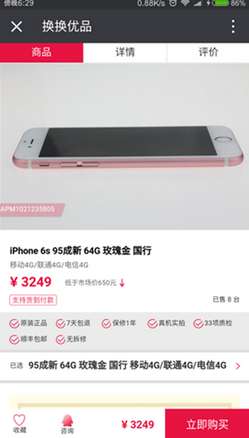 我們來做一個(gè)比較,一部玫瑰金、64G國(guó)行、全網(wǎng)通的iPhone 6s手機(jī),在換換優(yōu)品上選擇95成新,售價(jià)是3249元。95成新的手機(jī),使用痕跡很少,跟一臺(tái)全新機(jī)區(qū)別不大。