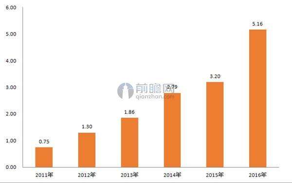 2011-2016年中國(guó)網(wǎng)絡(luò)零售交易額規(guī)模(單位:萬(wàn)億元)