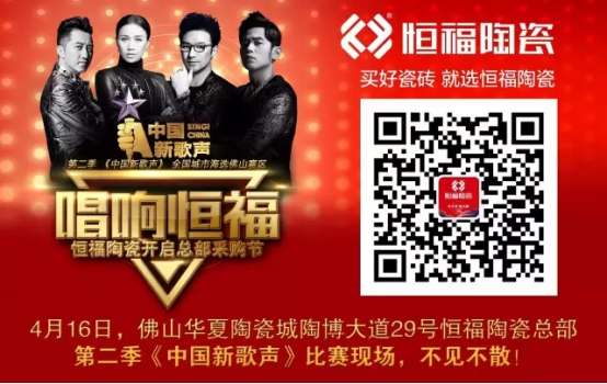 品音樂盛宴,買更好瓷磚!4月16號,我們在佛山華夏陶瓷城陶博大道29號恒福陶瓷總部,第二季《中國新歌聲》比賽現(xiàn)場,不見不散!