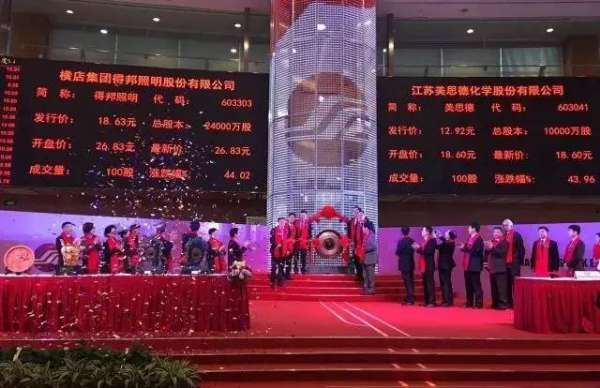 3月30日,得邦照明(603303)在上交所成功上市。得邦照明此次公開發行股票數量為6000萬股,發行價格為18.63元/股。得邦照明董事長倪強等,共同為公司鳴鑼開市,得邦照明開盤即漲停。