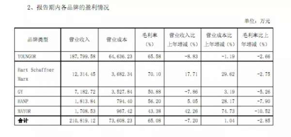 堅(jiān)持走品牌運(yùn)營(yíng)道路,也讓雅戈?duì)柨吹搅俗悠放频陌l(fā)展體系已漸為成熟。 報(bào)告期內(nèi),Hart Schaffner Marx、GY、HANP、MAYOR四個(gè)子品牌合計(jì)實(shí)現(xiàn)營(yíng)業(yè)收入2.30億元,平均增幅8.66%;銷(xiāo)售占比10.92%,較上年同期增加1.59個(gè)百分點(diǎn);實(shí)現(xiàn)銷(xiāo)售毛利1.40億元。