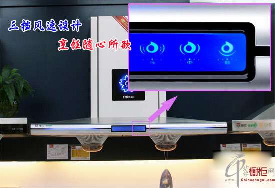 本款吸油煙機有強、中、弱三檔風速調節(jié),可以具體烹飪要求任意選擇。