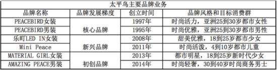 成立于1996年的太平鳥,最初以做男士襯衣起家,目前整體定位為時(shí)尚“中檔休閑服飾”。其旗下主要有六大品牌,分成核心、新興和初創(chuàng)三個(gè)梯度,以應(yīng)對(duì)細(xì)分市場(chǎng)的差異化需求,相互補(bǔ)充,交錯(cuò)發(fā)展。此外,太平鳥還于2015年入股了法國(guó)設(shè)計(jì)品牌AlexisMabille。