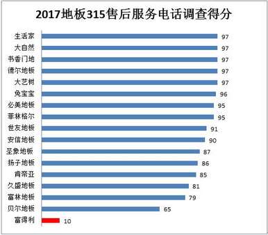 調(diào)查結(jié)果顯示,生活家、大自然、大藝樹、書香門地、德爾地板五家地板企業(yè)在315售后服務(wù)電話調(diào)查中以97分并列第一,有10家企業(yè)售后服務(wù)電話調(diào)查得分在90分或以上。富得利因為電話撥通3次無人接通,而以10分的成績墊底。