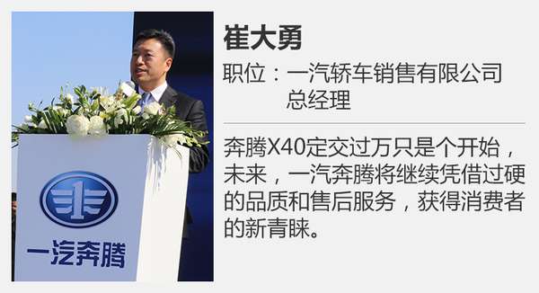 一汽轎車銷售有限公司總經理崔大勇先生率先宣布了奔騰X40上市一個月即訂交過萬的喜訊,隨后表示:“奔騰X40定交過萬只是個開始,未來,一汽奔騰將繼續憑借過硬的品質和售后服務,獲得消費者的新青睞。”