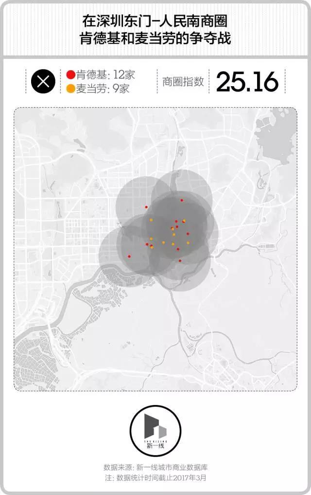 在2公里×2公里左右的范圍內,深圳的東門-人民南商圈共有12家肯德基和9家麥當勞,這些門店之間大多相距兩三百米,其中最近的是麥當勞光華分店和肯德基新園餐廳,只有174米。