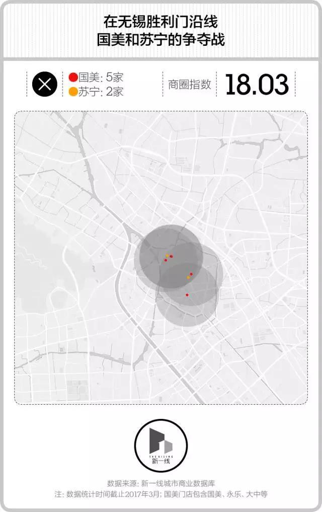 消費頻次相對較低的國美和蘇寧尚沒有如此密集地參加搏斗。但在無錫的勝利門區域,你也會看到國美和蘇寧幾乎挨著開店的策略,并且僅僅相隔1公里,它們就又成對地出現了。