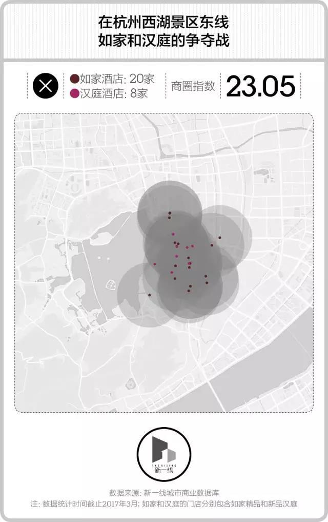 而在幾乎同樣的面積范圍內,杭州西湖景區的東線擠進了20家如家酒店和8家漢庭酒店。僅是在延安路慶春路這一個路口,就集中了3家如家和1家漢庭。這里的爭奪甚至超過了快餐店的激烈程度。