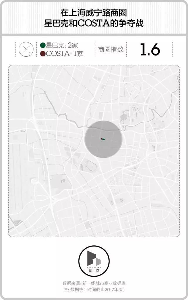這是兩個等級差異明顯的商圈組,留意下右上角的商圈指數就知道了。在上海頂級商圈南京路-人民廣場區域,51家星巴克力壓7家COSTA;而到了社區商業中心威寧路,COSTA與星巴克的門店家數就只相差1家了。
