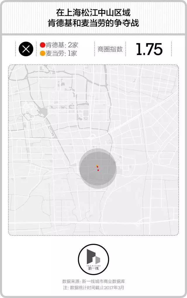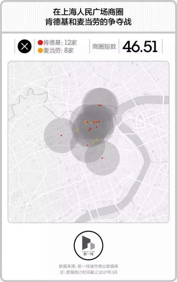 在與威寧路商圈指數相當的松江中山區域,肯德基和麥當勞的配置與星巴克和COSTA之間完全一致,都是2:1。但回到人民廣場商圈,肯德基和麥當勞的差距依然沒有全面拉開——12:8。