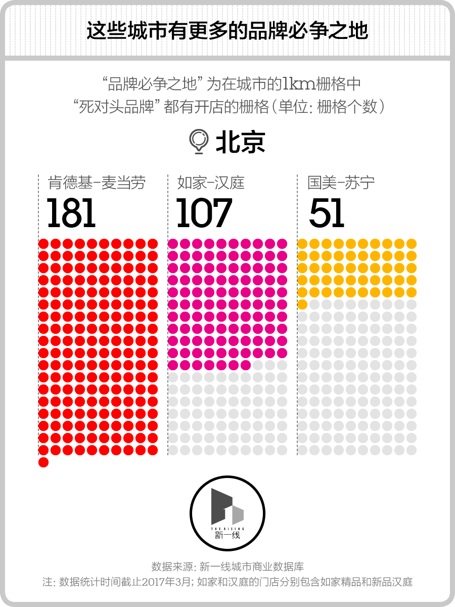 于是,新一醬統計了下肯德基vs麥當勞,如家vs漢庭,國美vs蘇寧這三對品牌在各個城市的必爭之地有多少塊。這里“品牌必爭之地”指的是,當把城市畫成1平方公里大小柵格后,那些一對“死對頭品牌”都有進駐開店的柵格。