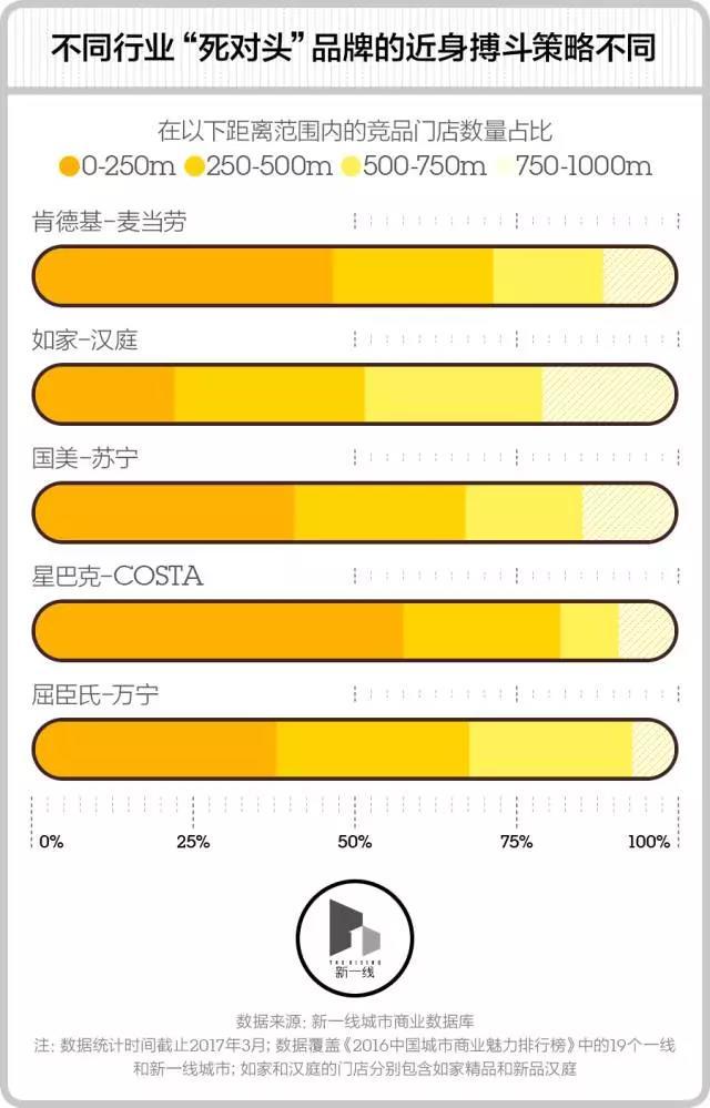 行業間的差異還體現在各對品牌的搏斗到底要“貼得多近”上。新一醬順手分析了5對品牌門店之間的距離,餐飲行業明顯需要在500米范圍內與對手正面交鋒,家電和藥妝零售與對手的距離也不能隔得太遠,酒店品牌則可以在1公里范圍內的任意空間里發動襲擊。