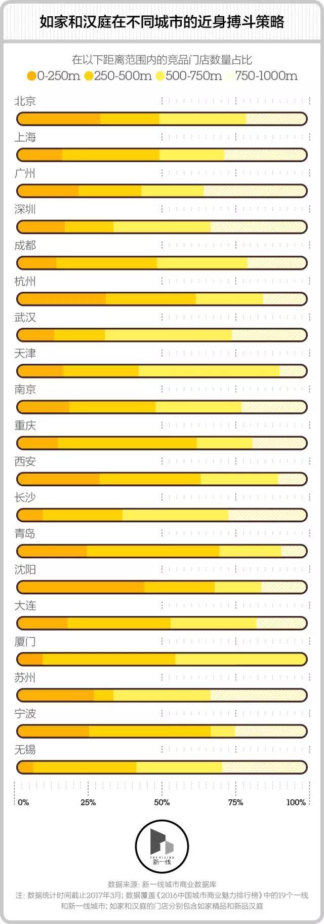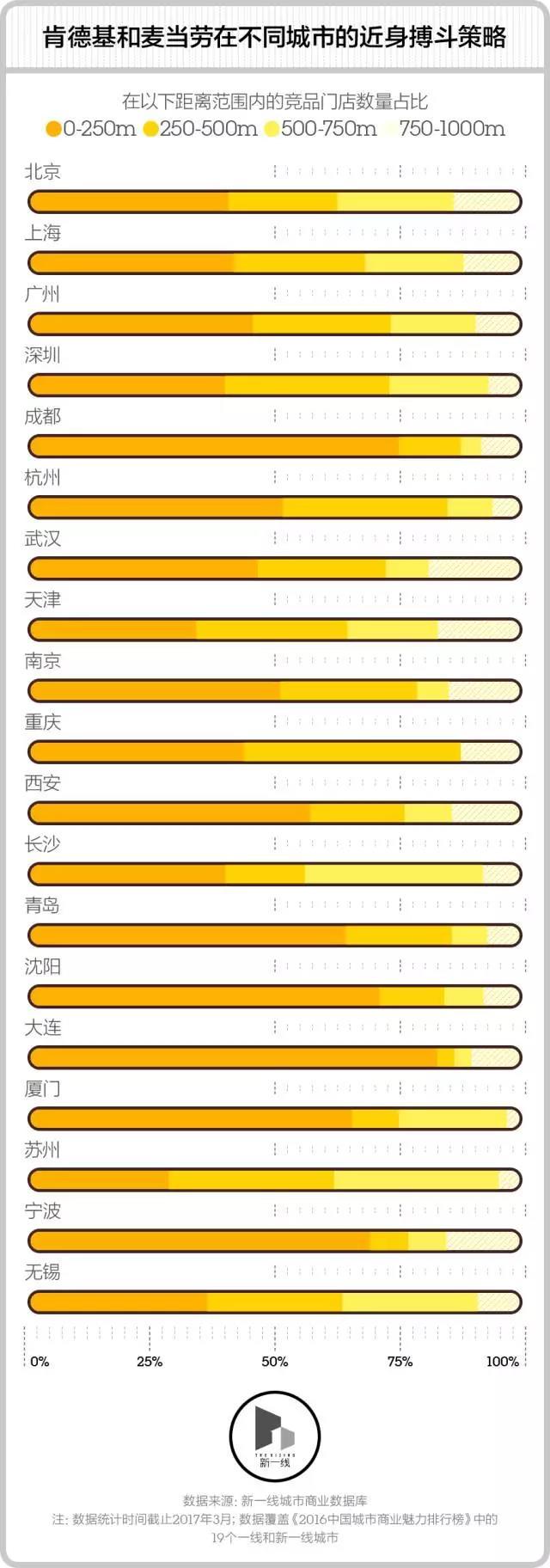 但新一醬不太明白的是,19座城市綜合起來看到的這種距離策略,細分到具體城市時,卻又有很大的差異。比如在沈陽和大連,百分之七八十的肯德基和麥當勞距離都在250米之內,而在廈門和無錫,如家和漢庭卻基本不會緊挨著開店。聰明如你,能告訴新一醬,這些城市之間的差異是怎么發生的嗎?
