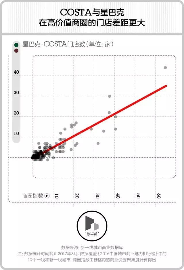 當商圈指數更高時,星巴克與COSTA的門店數量差異就會越大,它們之間有明顯的正相關。而到了肯德基與麥當勞對比時,這樣的正相關關系并不明顯,無論在什么樣強度的商圈內,這兩個快餐品牌的門店差距都控制在10家以內。也就是說,COSTA之所以比星巴克弱勢那么多,關鍵在于它在高價值商圈的門店數量無法緊跟星巴克的強勢擴張。
