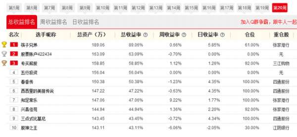 再從總收益榜上看,選手“筷子兄弟”繼續(xù)以89.06%的收益位居冠軍,其再度回歸次新銀行股。選手“股票賬戶422434”則以63.09%的收益位居亞軍,該選手目前選擇了空倉。而選手“專買熊股”以58.85%的收益率獲得季軍,其繼續(xù)持有三江購物。在此對以上選手獲得的好成績表示祝賀!