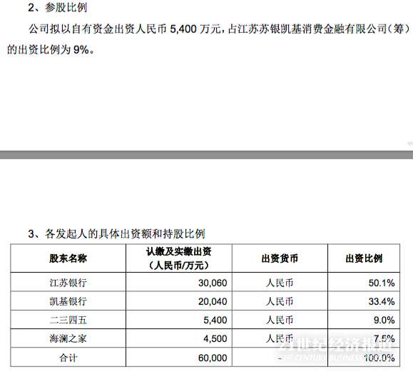 二三四五表示,2017年4月12日,公司與江蘇銀行、凱基銀行及海瀾之家共同簽訂了《發(fā)起人協(xié)議書》,擬以自有資金出資人民幣5400萬元與上述公司共同發(fā)起設立消費金融公司(籌,最終以工商行政管理機關核準的名稱為準)。本次投資完成后, 公司占消費金融公司的出資比例為9%。