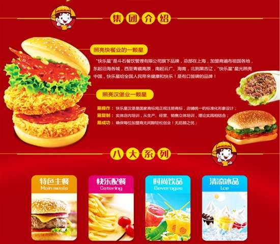 快樂星漢堡自2002年第一家門店開業(yè)以來,以令人震驚的速度飛速發(fā)展。于短短十五年的時(shí)間里,從一做起,如今快樂星漢堡已經(jīng)成為本土西式快餐連鎖加盟的一流品牌,門店數(shù)量已達(dá)近4000家,足跡可謂是遍布大江南北。快樂星漢堡不僅是ISO9001質(zhì)量管理體系的權(quán)威認(rèn)證企業(yè),商務(wù)部備案資料完善,全國(guó)質(zhì)量、服務(wù)、誠(chéng)信的AAA級(jí)企業(yè),還是世博會(huì)民營(yíng)企業(yè)館唯一一家西式快餐展出企業(yè)。快樂星漢堡的優(yōu)秀有目共睹,也是廣大加盟商值得信賴的好品牌。