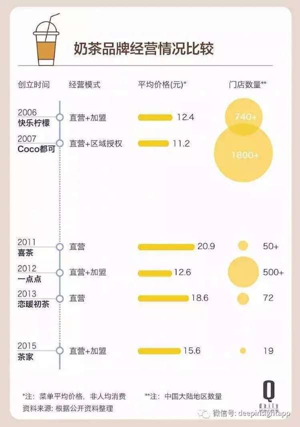 到了第三代,就是以一點點、喜茶、貢茶為代表。這些奶茶的特點就是有了奶蓋,茶都是沖泡出來的,很多還能免費加料。這時候許多奶茶都到了20元左右一杯的價格。而一點點為什么生意那么好,我認為就是定價比較好。15元左右的價格,東西比12元左右的Coco和快樂檸檬好喝,又比20元左右的奶茶便宜。下面這張圖來自好奇心日報,里面已經(jīng)有很詳盡的數(shù)據(jù)了。
