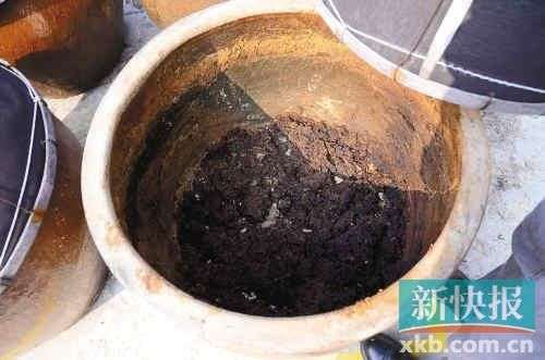 ■沁香源晾曬場上,一些曬缸里的豆豉已結塊,并有塑料雜質(zhì),工人稱這些曬缸已廢置。