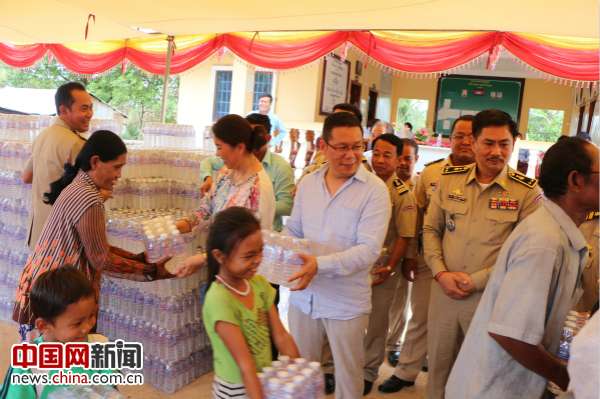 西港特區公司聯合區內企業向柬埔寨當地旱災災民捐贈飲用水。圖片由紅豆集團提供。