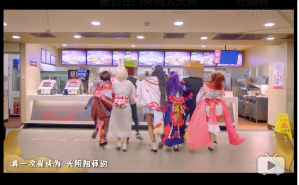 而整個視頻中,陰陽師中人物的設置、精良的動漫服飾制作、輕快風趣的舞蹈設計、肯德基門店的場景運用?????各種元素的整合,無不切中了二次元的應援粉絲、陰陽師的重度游戲愛好者、愛好肯德基的年輕群體以及其他泛二次元用戶的嗨點。