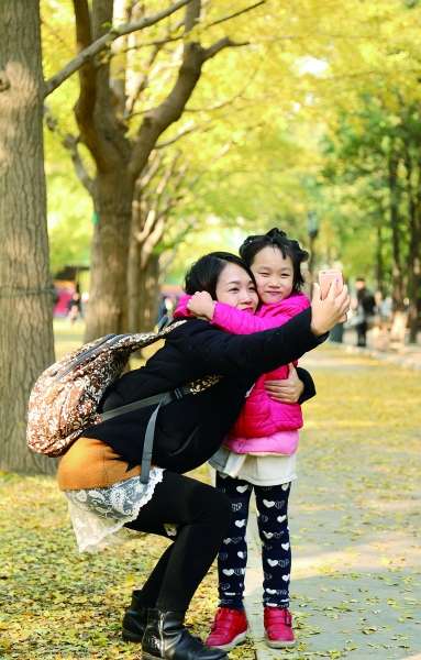 地壇銀杏節(jié)開(kāi)幕,市民賞秋景拍照留念